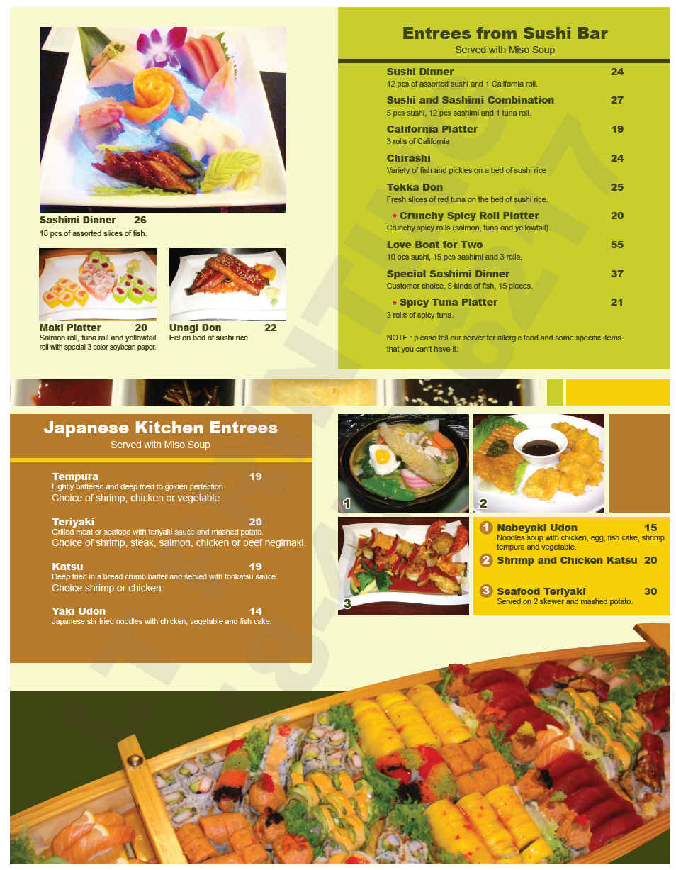 Home | Kitchen Menu | Hibachi Menu | Sushi/Rolls | Drinks/Sake | Lunch Menu | Happy Hour | Contact Us |